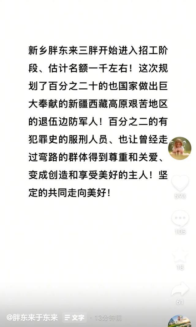 8月8日,胖东来创始人于东来在社交平台发布消息称,新乡胖东来三胖开始进入招工阶段,估计名额一千左右。