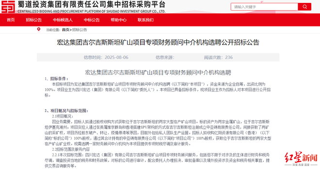日前,蜀道投资集团集中招标采购平台发布了《宏达集团吉尔吉斯斯坦矿山项目专项财务顾问中介机构选聘公开招标公告》。