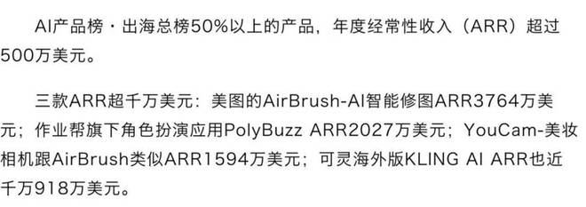 AI产品榜还指出,出海总榜50%以上的产品,年度经常性收入(ARR)超过500万美元。