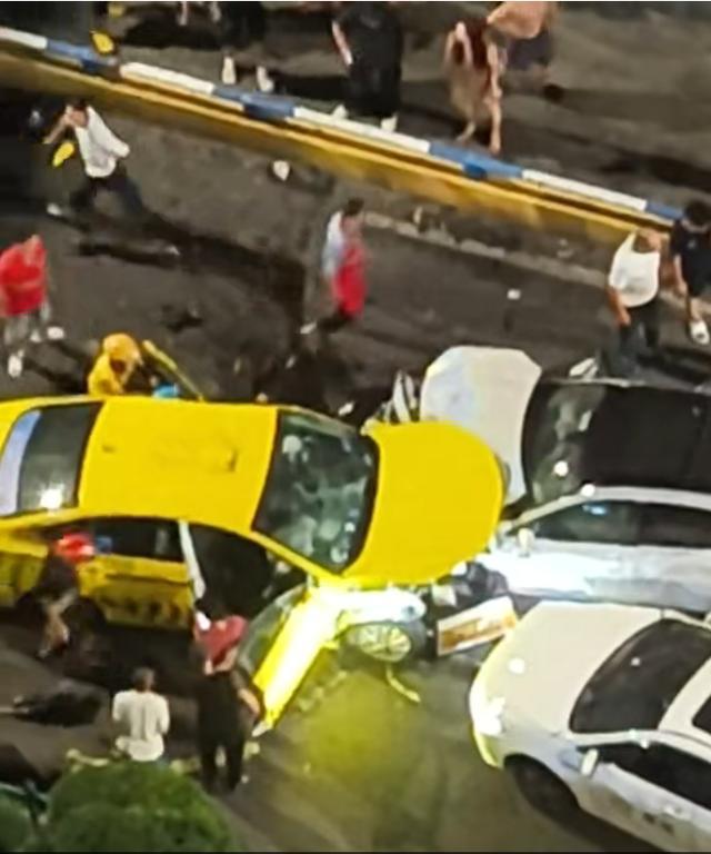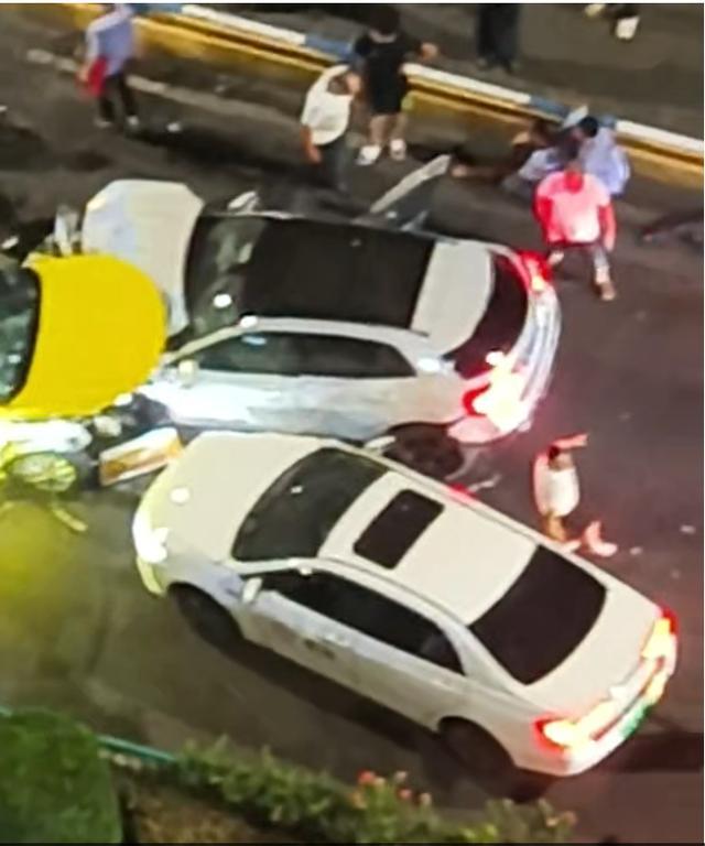 网上多段视频显示,一辆黄色出租车与一辆白色小轿车碰撞在一起,旁边另有一辆白色小车被擦挂,出租车引擎盖高高翘起,路边蹲着一人,一名穿黄色衣服的外卖小哥正在对出租车司机施救。