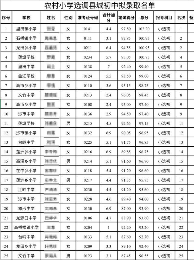 而出现在当地《农村小学选调县城初中拟录取名单》中的25名教师,4人总分过百,最低也有90.55分。