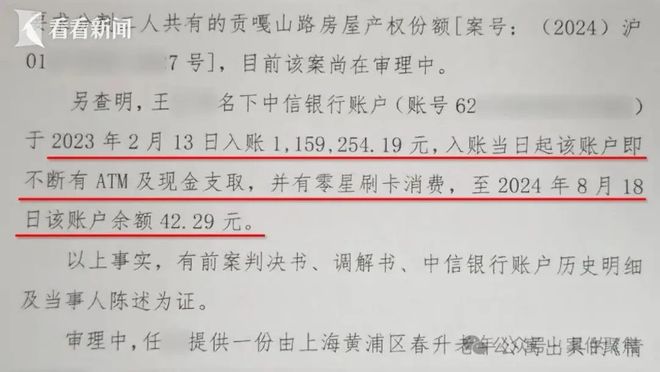 2024年8月,王静向黄浦区法院提起诉讼,请求变更王老伯的监护权。庭审中,王静透露了一个关键信息:此前判决给王老伯的110余万元补偿款,已转入由任芳实际控制的账户,而从2023年2月开始,任芳便每天从该账户中取现,最多的时候一天能取出5万元。截至2024年8月,原本110余万元的账户余额,只剩下了42.29元。