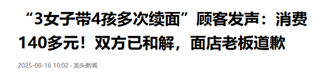 据河南电视台民生频道《大参考》记者实地走访求证,事件的完整脉络逐渐清晰。一切发生在8月13日晚上7点多,郑州一家饸饹面馆里,三名成年女子带着四个孩子走进店内就餐。不少人最初误以为她们“只点一碗面蹭续面”,但实际结算数据显示,一行人当天共计消费140.58元,其中确实有点一碗面,后续引发争议的“续面”行为,也并非无节制索取——就餐期间仅续面两次,第一次是成年女子提出续面,过程顺利;第二次是孩子表示没吃饱想续面,可就在这次续面时,店内厨师随口问了句“小孩几人吃饭”,这句话让在场的孩子觉得受了委屈,当场情绪低落。