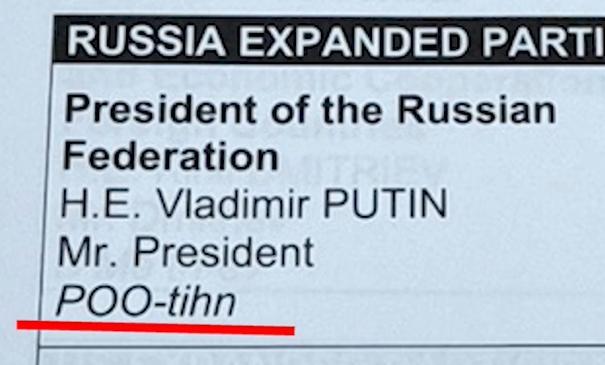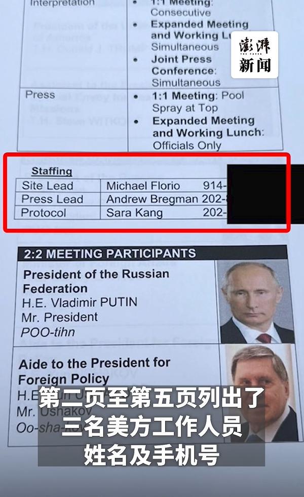 第二页至第五页列出了三名美方工作人员姓名及手机号,以及美俄13名政要姓名,文件甚至标注了普京名字的拼读方法,“POO-tihn”。