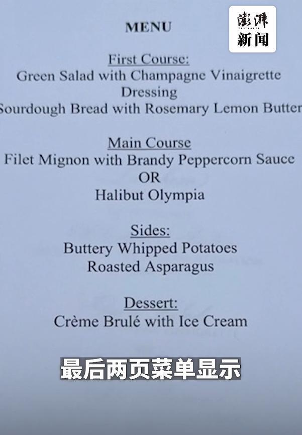 最后两页显示,原本为普京举办的午宴菜单中,包括绿蔬沙拉、奥林匹亚比目鱼配 腓力牛排及焦糖布丁甜点。
