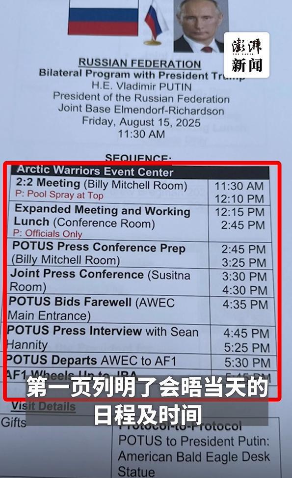 第一页列明了会晤当天的日程及时间,并精确到联合军事基地内具体会议室的名称,还透露特朗普计划向普京赠送“美国白头鹰桌饰雕像”。