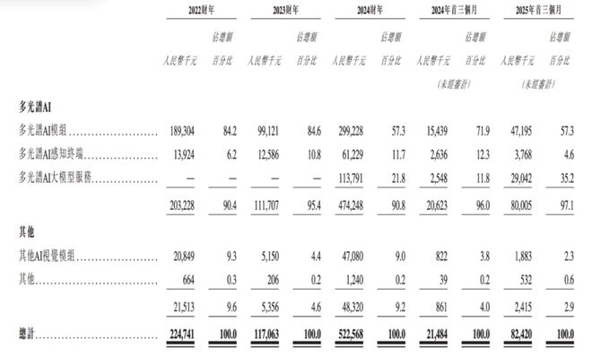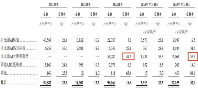 多光谱AI感知终端的营收占比分别为6.2%、10.8%、11.7%及4.6%,多光谱AI大模型服务2024年及2025年前三个月的营收占比分别为21.8%及35.2%。