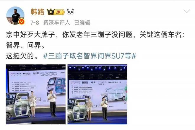 不久前,在宗申动力的电动三轮车发布会上,名为“智界S300”和“问界Q1P”的两款新车赫然在列,与汽车品牌鸿蒙智行的车型命名如出一辙。