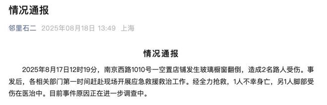 2025年8月17日12时19分,南京西路1010号一空置店铺发生玻璃橱窗翻倒,造成2名路人受伤。事发后,各相关部门第一时间赶赴现场开展应急救援救治工作。经全力抢救,1人不幸身亡,另1人脚部受伤在医治中。目前事件原因正在进一步调查中。