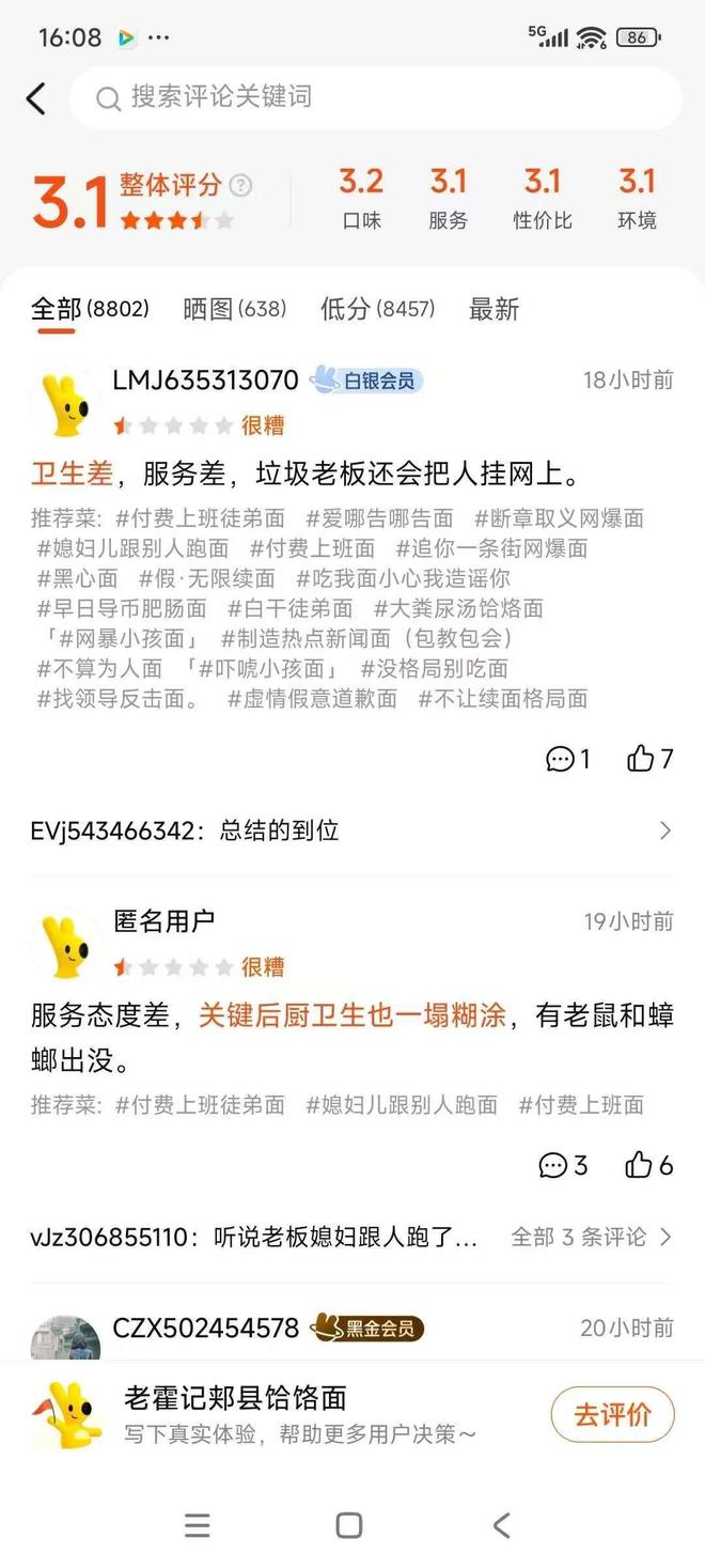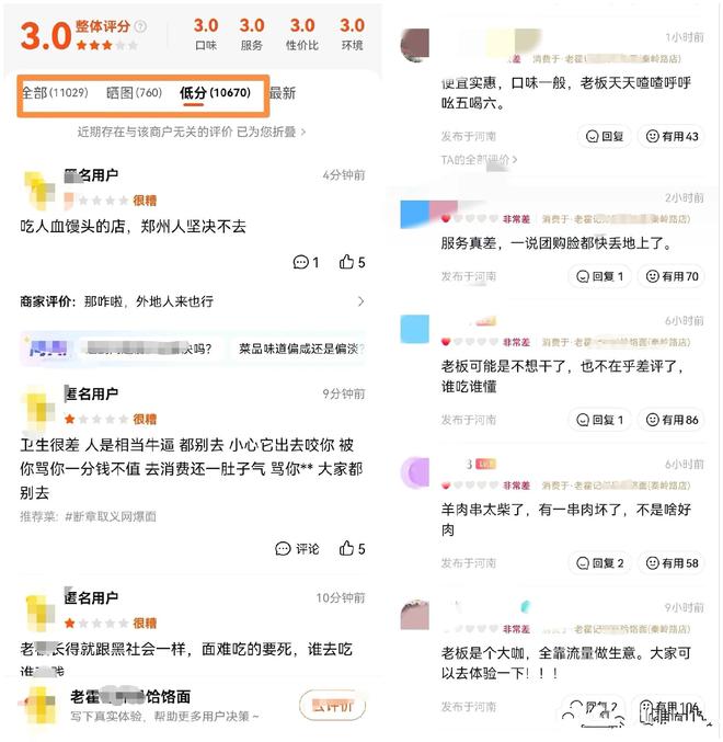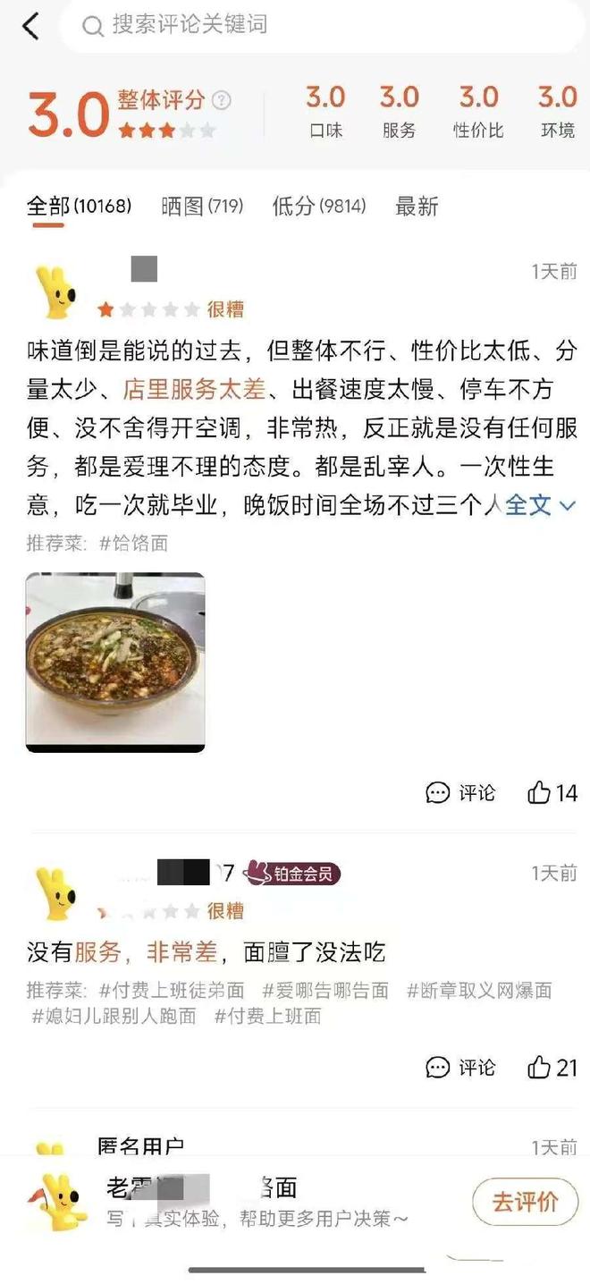 舆论发酵的同时,店铺的口碑也一落千丈。某平台数据显示,该店相关评论共11029条,其中差评10670条,97%的差评率创下不少人对本地餐饮的认知新低;美团平台上,开店四年多的“老霍记饸络面”,原本凭借口味和宣传积累了客单价253元的不错业绩,如今,整体评分直接跌破3.1分。