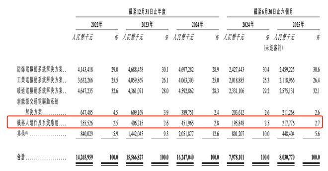 但就业绩贡献而言,则难言好看。早在2013年,SIR公司营收2766.3万欧元、净利润146万欧元,多年过去,卧龙电驱近几年机器人组件及系统应用占总营收比重始终只有2.6%左右。港股招股书显示,2022年-2024年、2025H1,公司该板块业务的营收分别为3.56亿元、4.06亿元、4.52亿元和2.18亿元,占比为2.5%、2.6%、2.8%和2.7%。