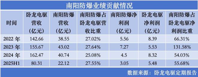 观察君梳理数据显示,2022年-2024年、2025H1,南阳防爆分别实现营收38.55亿元、43.02亿元、40.74亿元和22.12亿元,占卧龙电驱总营收的27.02%、27.64%、25.08%和27.55%;南阳防爆实现净利润分别为5.56亿元、7.27亿元、4.5亿元、3.05亿元,占卧龙电驱总净利润的比例为66.31%、131.58%、54.03%和55.68%。