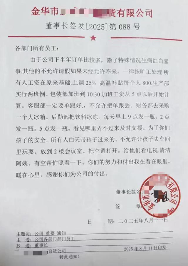 这份落款为“董事长签发〔2025〕第088号”的通知中写道:“由于下半年订单比较多,除了特殊情况生病红白喜事,其他的不允许请假……加班工资从(下午)5点以后开始计算。”同时明确涨薪和补贴“所有人工资上调25%,高温补贴每个人800元”,且由后勤每天三次统一发放冰水。
