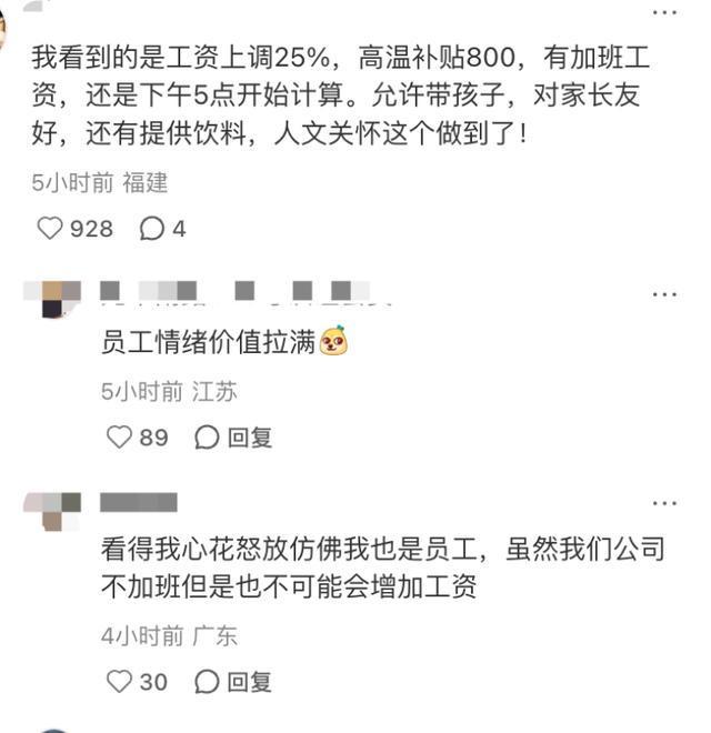 杨女士强调,通知中提到的涨薪、高温补贴、饮品发放等安排,都不是“画饼”,“是真实存在的,员工确实都拿得到的,大家对公司都挺满意的,对老板风评也挺好。”