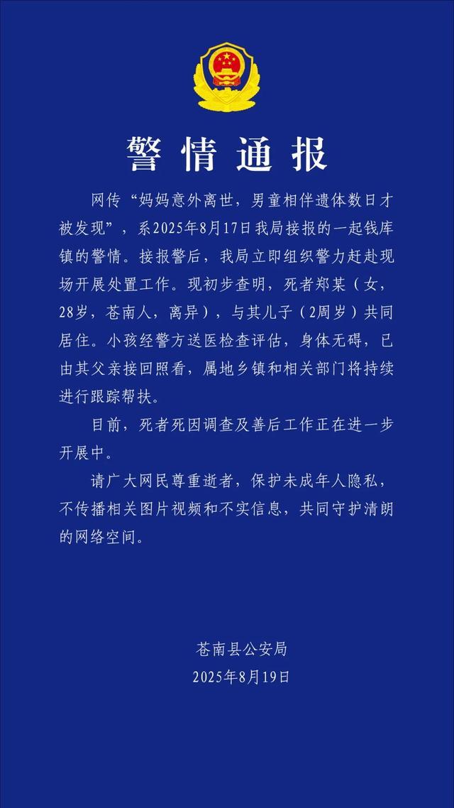 网传“妈妈意外离世,男童相伴遗体数日才被发现”,系2025年8月17日我局接报的一起钱库镇的警情。接报警后,我局立即组织警力赶赴现场开展处置工作。现初步查明,死者郑某(女,28岁,苍南人,离异),与其儿子(2周岁)共同居住。小孩经警方送医检查评估,身体无碍,已由其父亲接回照看,属地乡镇和相关部门将持续进行跟踪帮扶。