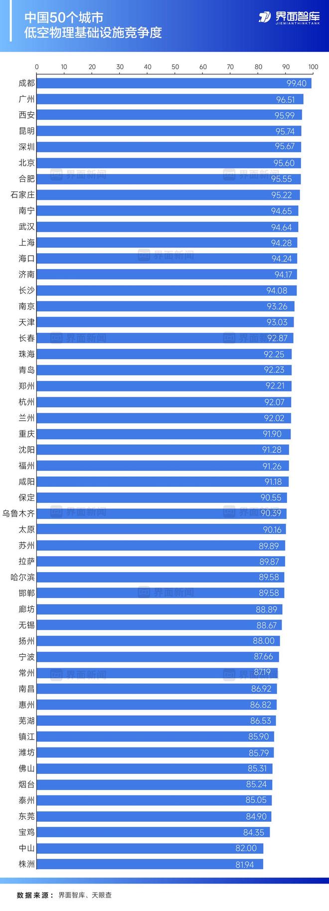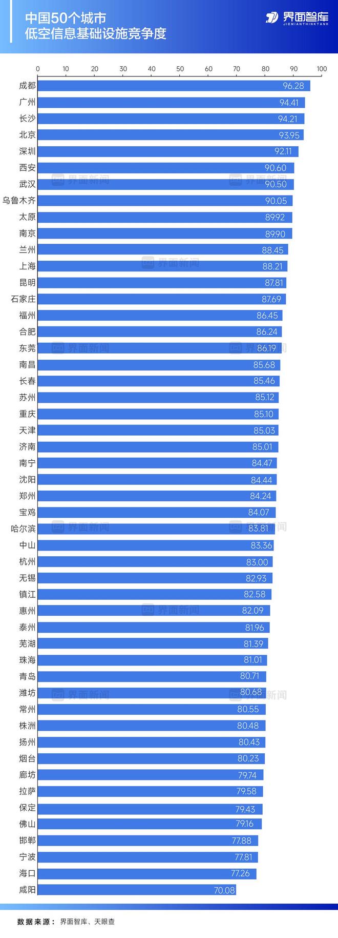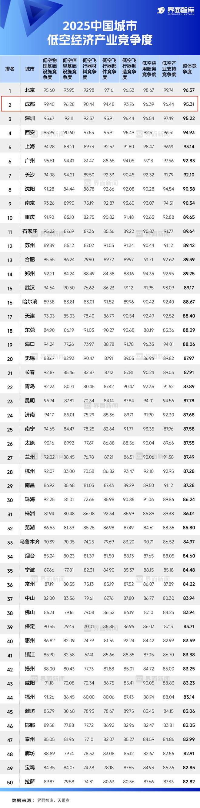 城市低空经济产业竞争度排名公布:成都位列第二,两大指标领跑全国!