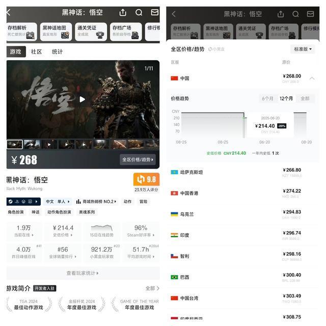 一年过去,在各售卖平台,记者看到,《黑神话:悟空》的销售价格依然坚挺,标价268元,记者查询到曾经最大的活动优惠后,价格也在214元。在同类游戏中属于“顶流”存在!