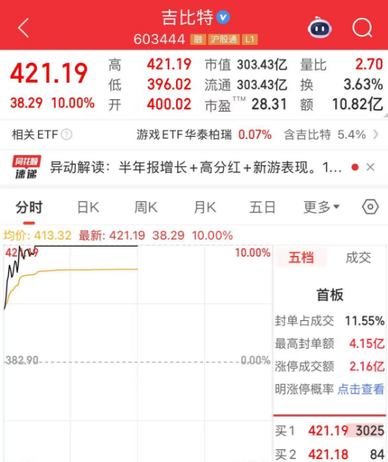 8月20日,吉比特高开高走,开盘不久后就涨停,截至发稿,报421.19元/股,总市值303.43亿元。