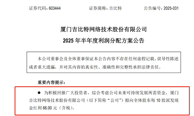 拟10派66元!“游戏茅”吉比特又大手笔分红,董事长上半年分得1.41亿元