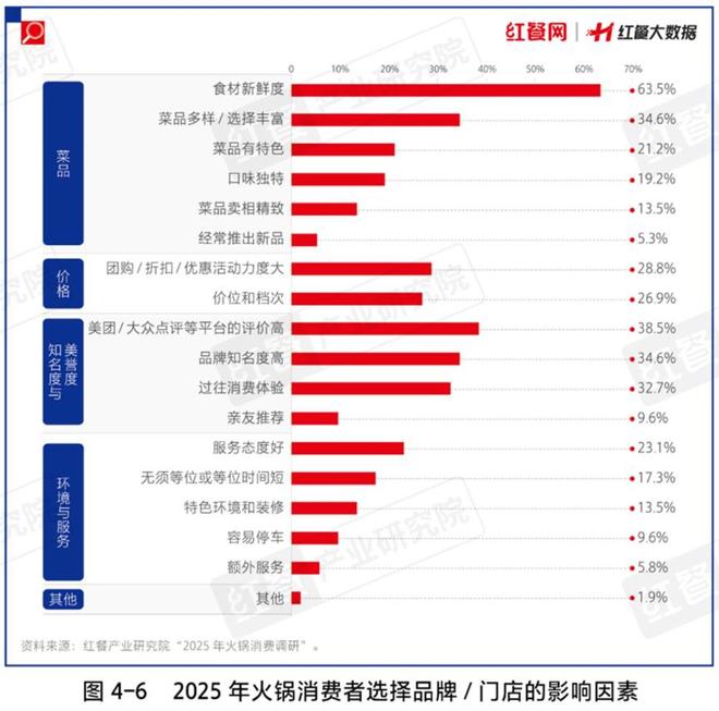据红餐产业研究院“2025年火锅消费调研”,食材新鲜度、菜品多样/选择丰富是消费者选择品牌/门店的最重要因素。