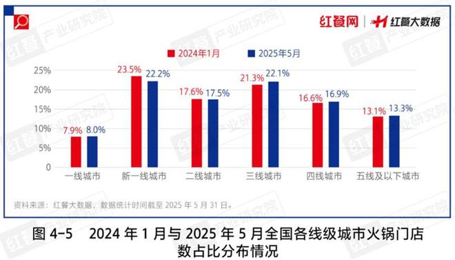 在线级城市分布方面,火锅赛道整体延续下沉的态势。红餐大数据显示,截至2025年5月,三线及以下城市占比为52.3%,较2024年1月提升1.3个百分点。同时,下降最为明显的是新一线城市,从2024年1月的23.5%下降至2025年5月的22.2%。