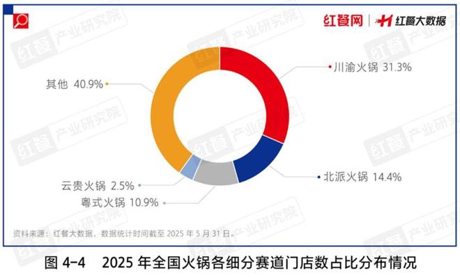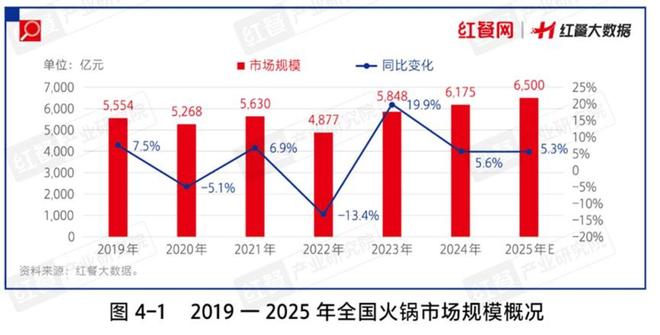 据红餐大数据,2024年,我国火锅市场规模达到6,175亿元,同比增长5.6%,略高于餐饮大盘的增速(5.3%)。预计2025年火锅赛道市场规模稳步增长,有望达到6,500亿元。截至2025年5月,全国火锅门店总数已经超过49万家。