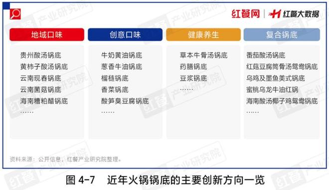 此外,火锅品牌还在不断开发地域风味,如酸辣结合的贵州酸汤火锅、云南特色酸菜牛肉火锅、讲究本味的广东粥底火锅、去腥提鲜的海南糟粕醋火锅等。除地域火锅以外,创意口味、健康养生、复合锅底也是火锅锅底创新的主要方向。