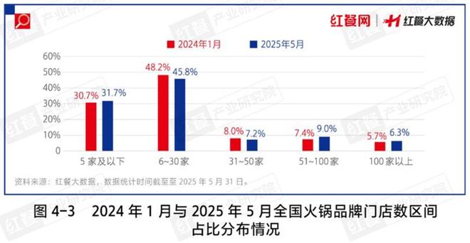 随着火锅赛道的进一步发展以及竞争的加剧,连锁品牌在竞争中优势更为明显,连锁化率不断提升,据红餐大数据,50家以上的火锅品牌数占全国火锅品牌数的占比,从2024年1月的13.1%提升至2025年5月的15.3%,表明头部火锅品牌越来越强势,占据了更多的市场份额。