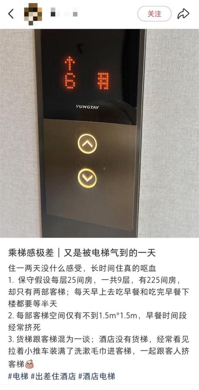 例如前文中提到的老张,其暑期在贵阳入住某中高端酒店时,发现该酒店200间客房,配备了2部电梯,且电梯空间不算大,高峰期十分拥挤。