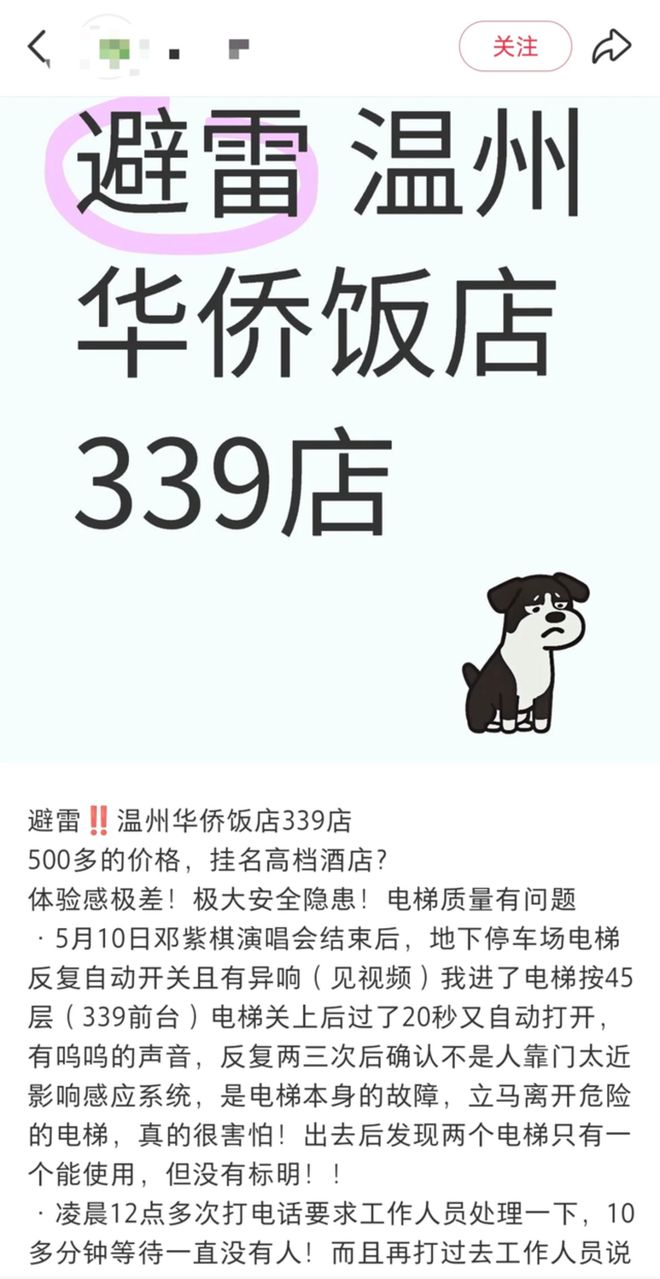 据小红书网友爆料,今年5月,入住温州华侨饭店339店时,高楼层的电梯伴随着诡异声音,在半夜自动开关门,且两部电梯仅有一部能使用。在深夜遭遇如此场景,住户的恐惧感可想而知。