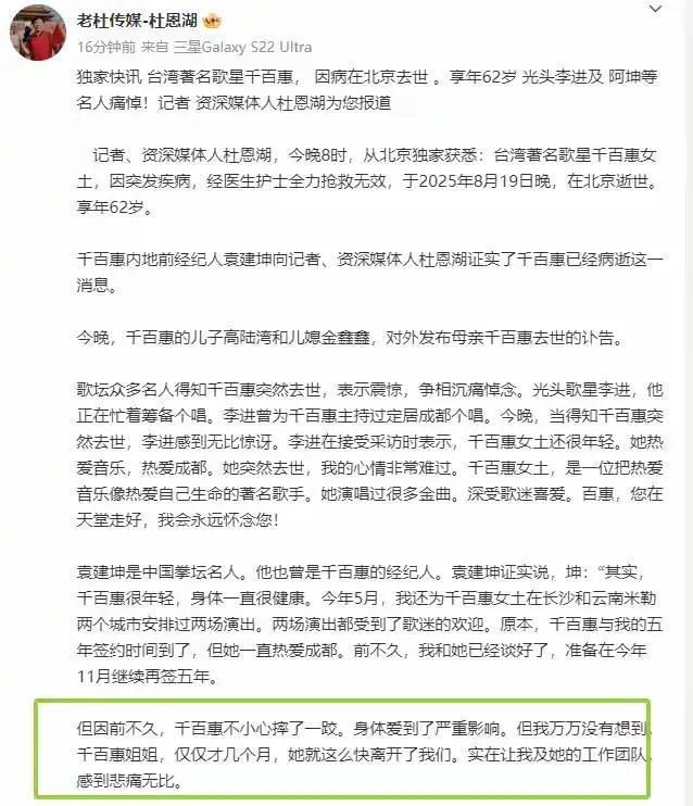 还有知情人透露,其实在数月前,千百惠曾有过一次摔倒,那次意外让她的身体受到严重影响,只是她没让外界察觉这份虚弱;更让人动容的是,她本已确定要在本周日(距去世仅4天)和黄安等歌手去山西阳泉参加演唱会,甚至还专门录制了宣传视频,视频里的她红光满面,精神状态看上去十分健康,即便那时已在治疗中,她也没退掉演出,这份对工作的敬业,和对自己能康复的积极心态,如今想来更添遗憾。