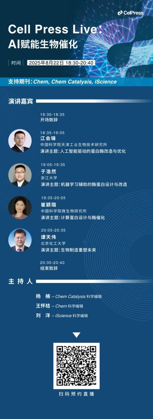 主讲人:谭天伟(北京化工大学校长、中国工程院院士)、江会锋(中国科学院天津工业生物技术研究所二级研究员、博士生导师)、于浩然(浙江大学“百人计划”研究员、浙大杭州国际科创中心合成生物学研究所副所长)、崔颖璐(中国科学院微生物研究所青年课题组PI、博士生导师)