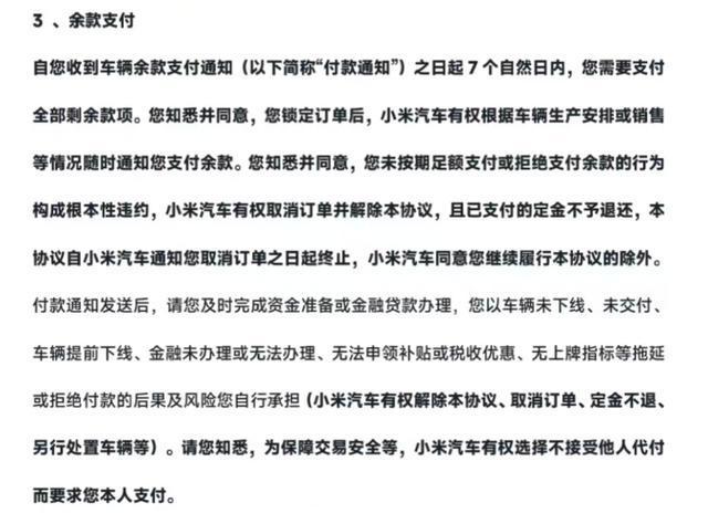 小米汽车的购车协议显示:自您收到车辆余款支付通知起的7个自然日内,您需要支付全部剩余款项。您知悉并同意,您锁定订单后,小米汽车有权根据车辆生产安排或销售等情况随时通知您支付余款。您知悉并同意,您未按期足额支付或拒绝支付余款的行为构成根本性违约,小米汽车有权取消订单并解除本协议,且已支付的定金不予退还,本协议自小米汽车通知您取消订单之日起终止,小米汽车同意您继续履行本协议的除外。