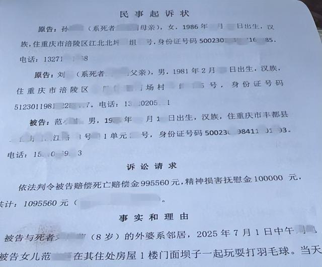 2025年7月1日,重庆8岁女孩萌萌(化名)被邻居范某带到长江游泳不幸溺亡,家人称范某和他们不熟,其带走萌萌前也未告诉他们任何人。8月21日,记者从萌萌家人处获悉,他们已起诉范某,索赔109.556万元,法院已经立案。