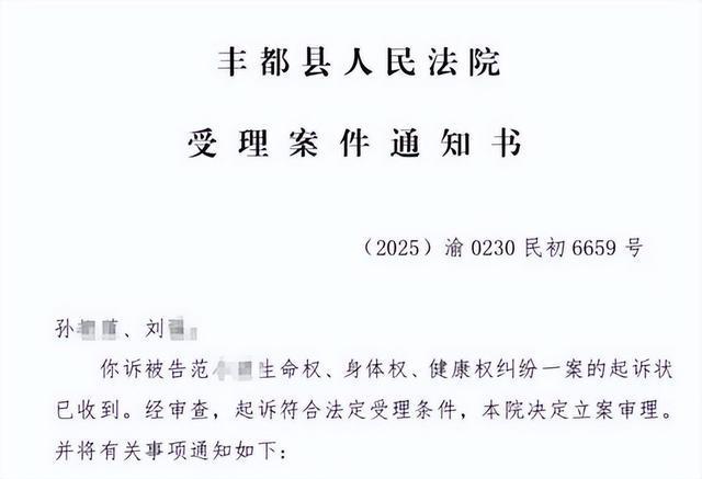 孙女士表示,多少钱也买不到女儿花一般的生命,他们索赔也并不是为了钱,而是想为女儿讨个公道。近日,孙女士收到了丰都县人民法院的受理案件通知书:“经审查,起诉符合法定受理条件,本院决定立案审理。”