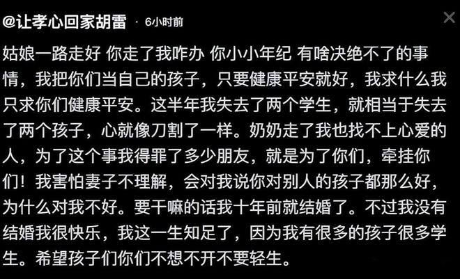 消息传来时,这个经历过无数风雨的汉子胡雷,在镜头前第一次崩溃:“半年走了两个学生,我真的想不通……”他翻出手机里薛某某的照片,照片中女孩抱着新书包笑得灿烂,与如今冰冷的警情通报形成残酷对比 。靖远某中学老师透露,薛某某家庭结构复杂,父母离异后兄弟姐妹分散抚养,长期缺乏稳定的家庭支持 。