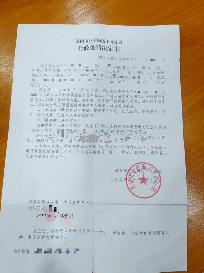 2024年11月25日,济南市公安局历下区分局出具行政处罚决定书,认定张泉以擦碎发为由,多次用一只手拉开女孩衣领,另一手持毛巾从领口伸入衣服内触碰胸部,构成猥亵未成年人,给予14日行政拘留。张泉对此不服,认为监控和现场情况均能证明自己清白,还找多人查看监控,均未发现不当行为,于是在2024年12月13日向法院提起诉讼,要求撤销该行政处罚。