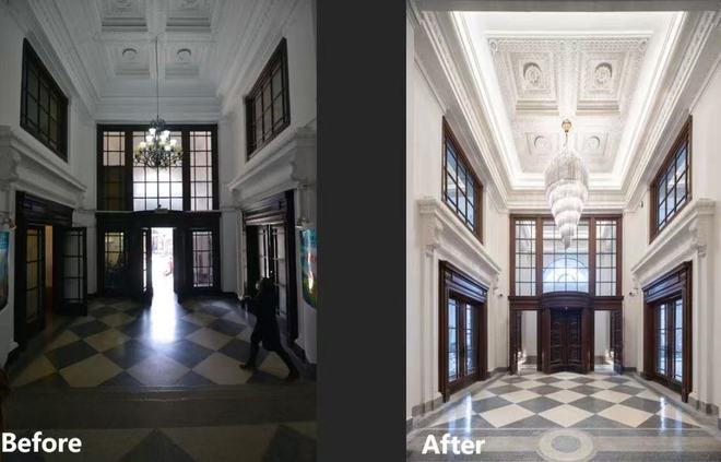 大楼底层大堂修复前后对比。图片来源:百联资控
