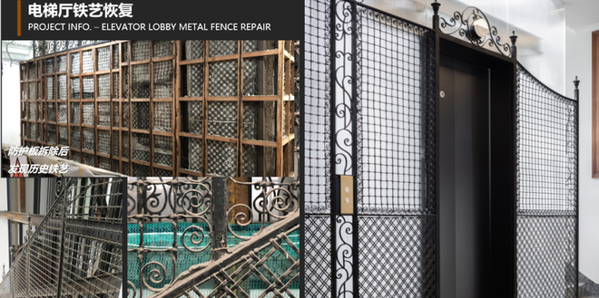 “如拆除夹层至5层电梯井道墙后加的木饰面板后,发现在井道南、北墙原隔墙龙骨内还散落着隐藏在原电梯外围残损的铁艺栅栏遗存,于是对电梯厅南、北侧墙铁艺栅栏予以保留修缮,对电梯门侧即东侧根据现存实样复原铁艺栅栏;大楼首层南北两侧办公空间均有夹层,但原夹层仅加至沿街面后退一柱跨位置,进场时夹层已满铺,为实现沿街界面品质提升,尊重历史原貌,决定拆除临东立面一跨的夹层楼板。” 百联资控方告诉研究员。
