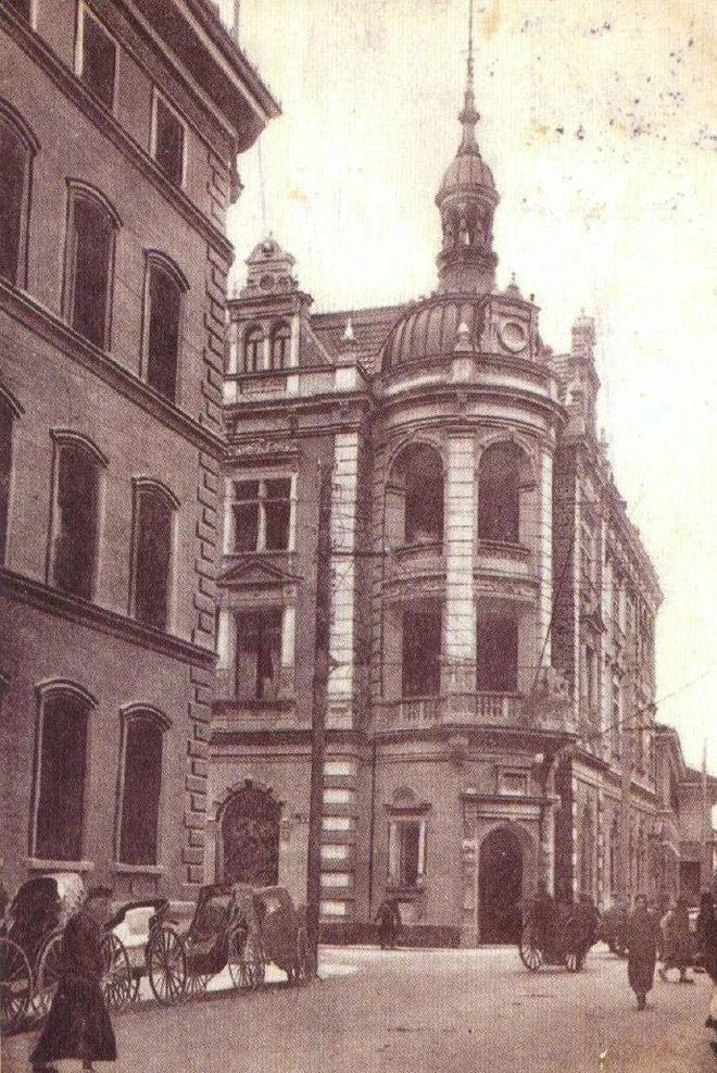德国书信大楼1949年照片,此时经历过大火,修缮后立面简化,立面雕饰已不存。图片来源:pastvu.com