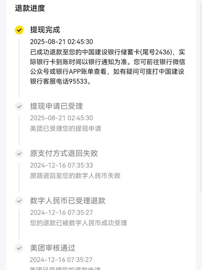 晋莉提供的截图显示,2024年12月16日7时35分,美团受理了她的退款申请,审核通过;同一分钟,数字人民币已受理退款,但原支付方式退回失败。