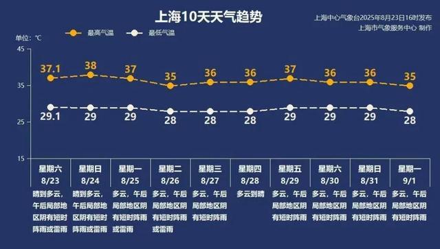 2025年08月24日08时29分,上海中心气象台发布高温橙色预警信号:预计上海市当天的最高气温将超过35℃,其中中心城区、闵行、嘉定、宝山、浦东、松江、青浦等地的最高气温将超过37℃,请注意防范强高温对工农业生产、人体健康的不利影响,确保生产、消防、用电等方面的安全。