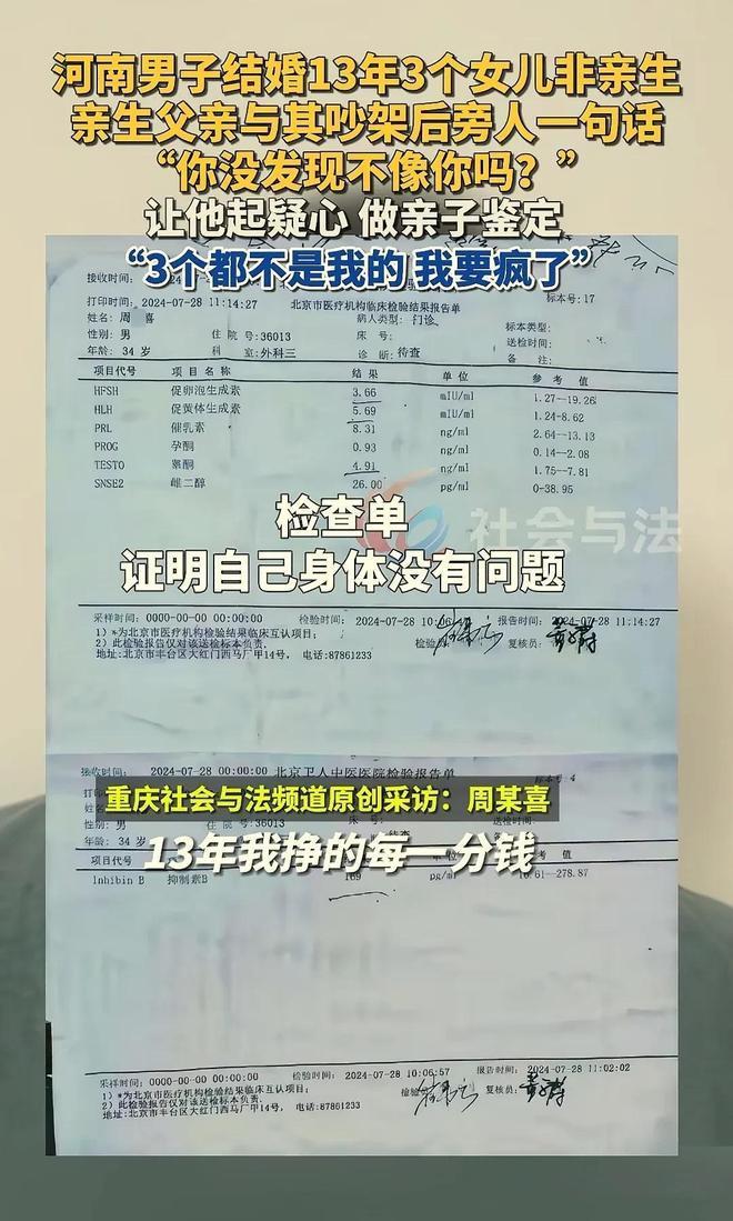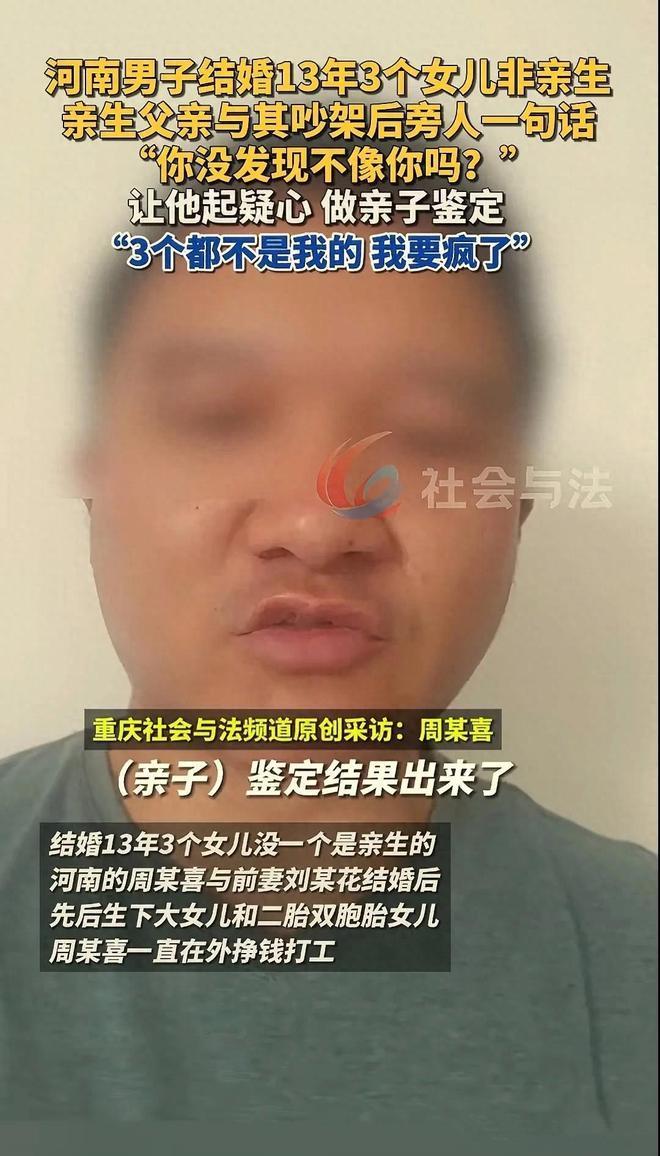 周某喜与妻子结婚的13年里,始终扮演着“家庭顶梁柱”的角色。为了支撑家用,他常年在外务工,风里来雨里去从无抱怨,挣得的每一分钱都会悉数交给妻子,只盼着妻子能安心照顾孩子,一家人日子能安稳顺遂。三个女儿的到来,曾是他生活里的光——第一胎是个伶俐的女儿,第二胎更是一对可爱的双胞胎女儿,旁人偶尔的羡慕,让他觉得所有辛苦都有了归宿,他从未怀疑过这份“圆满”背后藏着秘密。