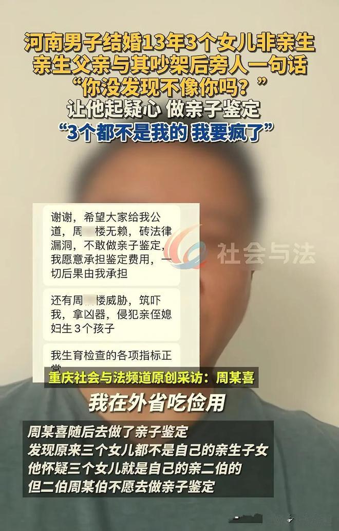 为了弄清真相,周某喜悄悄带着自己和三个孩子的样本做了亲子鉴定。等待结果的日子里,他无数次自我安慰是想多了,可鉴定报告上的结论却给了他致命一击——三个孩子,没有一个与他存在亲生血缘关系。13年的付出、13年的疼爱,原来都建立在谎言之上,他甚至不得不怀疑,孩子们的生父就是自己的亲二伯。