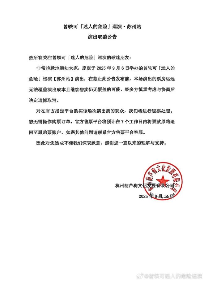 8月14日下午5点,曾轶可巡演苏州站主办方杭州葫芦狗文化发展有限公司(微博账号“曾轶可迷人的危险巡演”)发布取消公告,称原定于今年9月6日曾轶可“迷人的危险”巡演苏州站票房远远无法覆盖演出成本,且继续售卖仍无覆盖的可能,经多方慎重考虑与协商后决定遗憾取消。