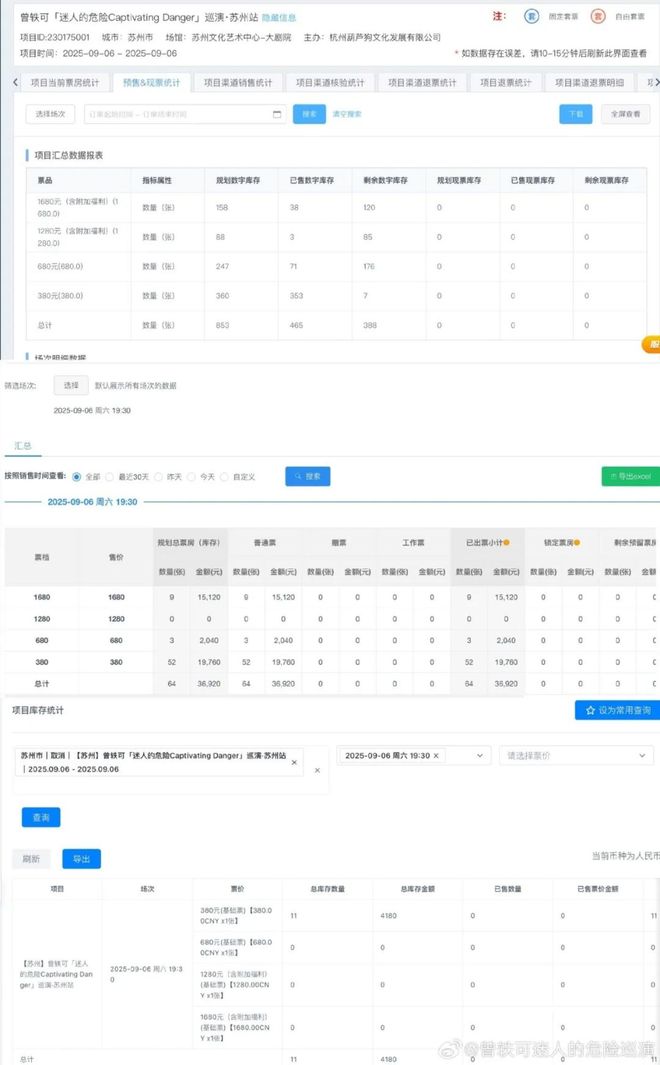 这也直接导致了后续苏州站票房被挂出。15分钟后,主办方转发工作室声明,并公布了后台票务销售数据截图。经查证,主办方所公布的票房数据来自大麦、猫眼、票星球三个票务平台。从截图来看,三个平台总共售出529张票,总票房约28.7万元,大麦250100元,猫眼36920元,票星球0元。
