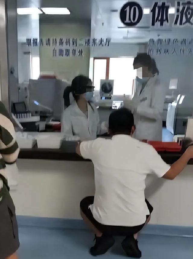 时长6秒现场视频显示,检验科工作台前,一名男子蹲在地上,趴在窗口和里面戴口罩的医护人员在沟通。