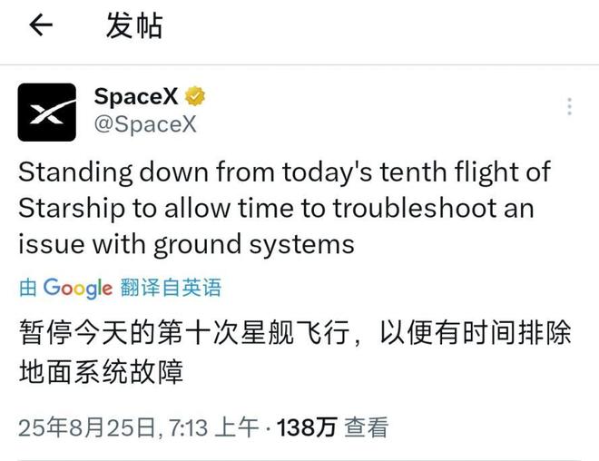 据央视新闻报道,当地时间8月24日傍晚,原定于当天进行的星舰第十次试飞被取消。SpaceX在社交平台X上发帖称,原因是地面系统(指发射台及其周边支持起飞的基础设施)出现问题。