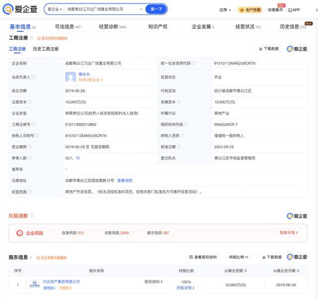 成都青白江万达广场置业有限公司成立于2019年5月,法定代表人为甯佐夫,注册资本1亿元人民币,经营范围为房地产开发经营。股东信息显示,该公司由万达地产集团有限公司全资持股。