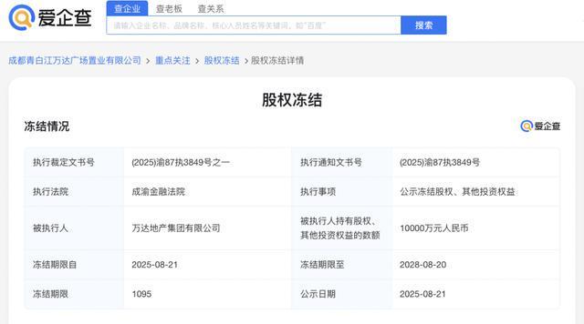 爱企查App显示,近日,万达地产集团有限公司新增一则股权冻结信息,股权所在企业为成都青白江万达广场置业有限公司,冻结股权数额1亿人民币,冻结期限为3年,执行法院为成渝金融法院。